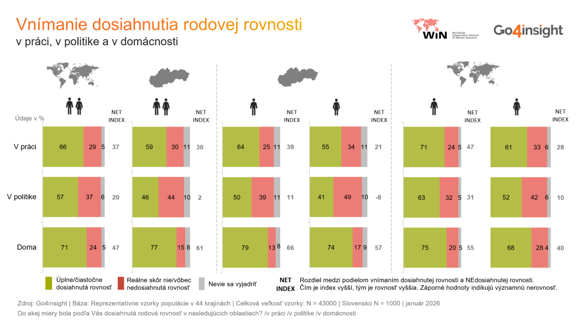 Muži vnímajú rodovú nerovnosť optimistickejšie, ženy najmenej rozdielov cítia doma